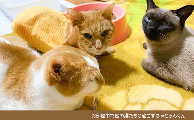 皆さまからの温かいご支援のおかげで糖尿病と腎臓病の治療を続けることができ、ちゃとらん君はインシュリンと皮下点滴を毎日がんばりました。19年間という猫生のうちのわずか半年という短い時間でしたけれど、お部屋の仲間の猫たちと穏やかに過ごすことができました。