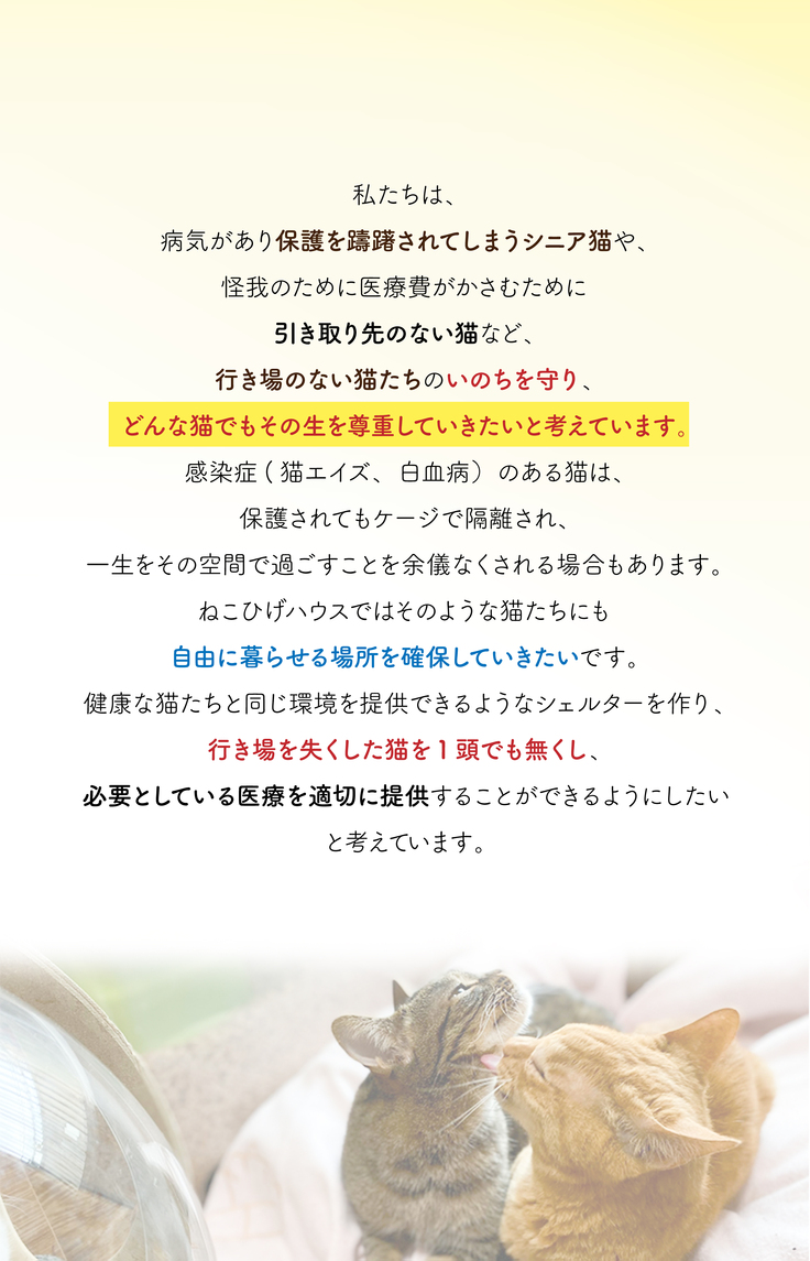 そのためクラウドファンディングを通じて皆さまからご支援をいただき、シニア猫や傷病猫に対してのケアを適正に継続し、いのちを守る最後の砦としてシェルターを運営していきたいのです。