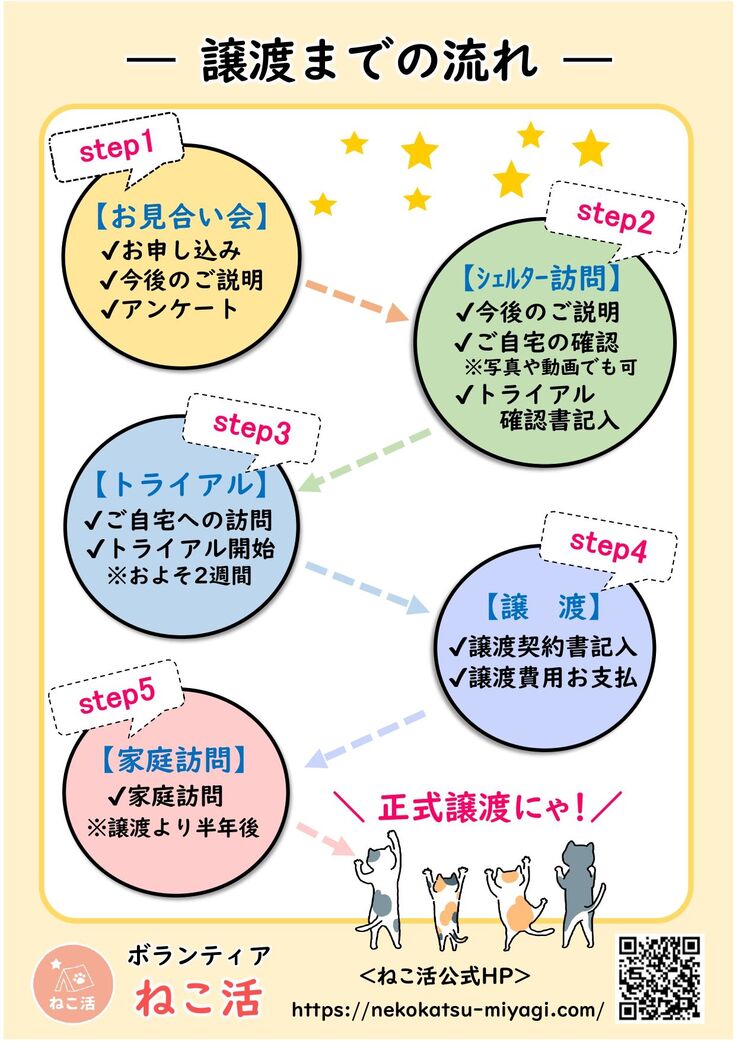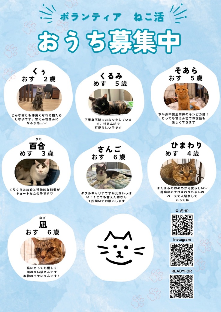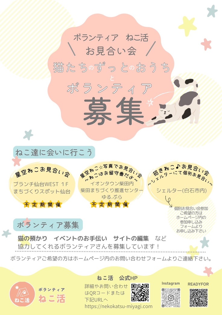 宮城県内の保健所や愛護センターから傷病猫や引き取り手のいない成猫を中心に お迎えし治療やケアをして新しい飼い主さんに繋ぐ譲渡推進活動をしておりますボランティア 「ねこ活」と申します。