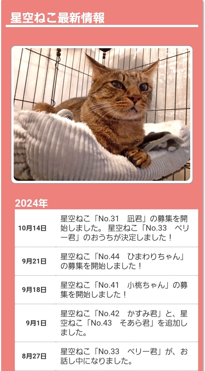マンスリーサポートプロジェクトは令和5年1月からスタートしており令和6年10月末に新しい情報に更新しております。いつも応援くださるサポーター様には感謝しかありません。いつもありがとうございます。また、はじめてボランティア「ねこ活」を 知ってくださった方々 沢山のプロジェクトの中から見つけて頂けたこと感謝いたします。