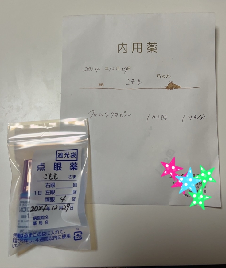 目の表面には傷はなく、ヘルペスが検出されヘルペス治療投薬と、抗生剤の目薬をいただいてきていただいてます。