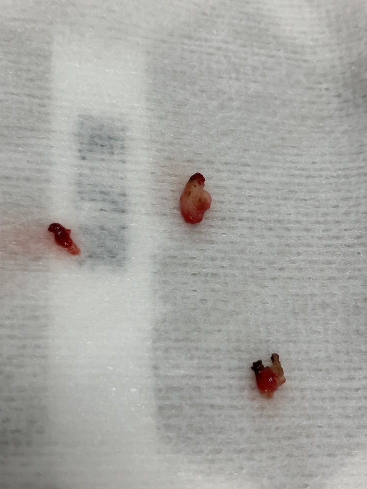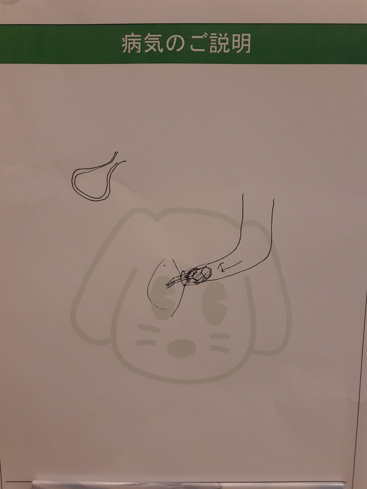 耳の中を見ると大きな出来物?が見受けられたとのことで肉腫なのか異物なのかを確認してから、焼きながら切除とのことでした。