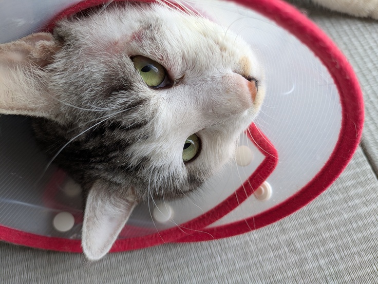 昨日、半日入院を終えて本日分の投薬をいただいて、夜にエリザベスカラーを外したら朝麻痺し目元が気になったのか、耳の中が気になったのか朝血だらけになっていました。幸い傷は大きくなく安心しましたがやはり違和感があったんてしょう。