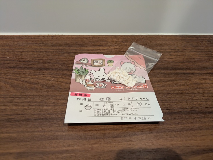 4月25日、[ひらりちゃん]肝臓の薬ニチファーゲンをいただいています。