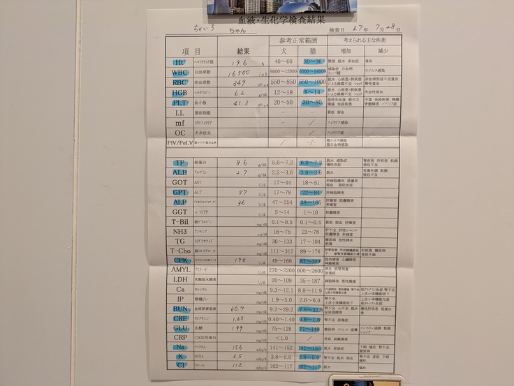 一般血液検査では貧血、脱水。脱水の為腎数値が上がってました。あとは大きく外れてるとこはありませんでした。貧血は糞便検査で見つけたたくさんのマンソンと栄養失調だろうとのこと。