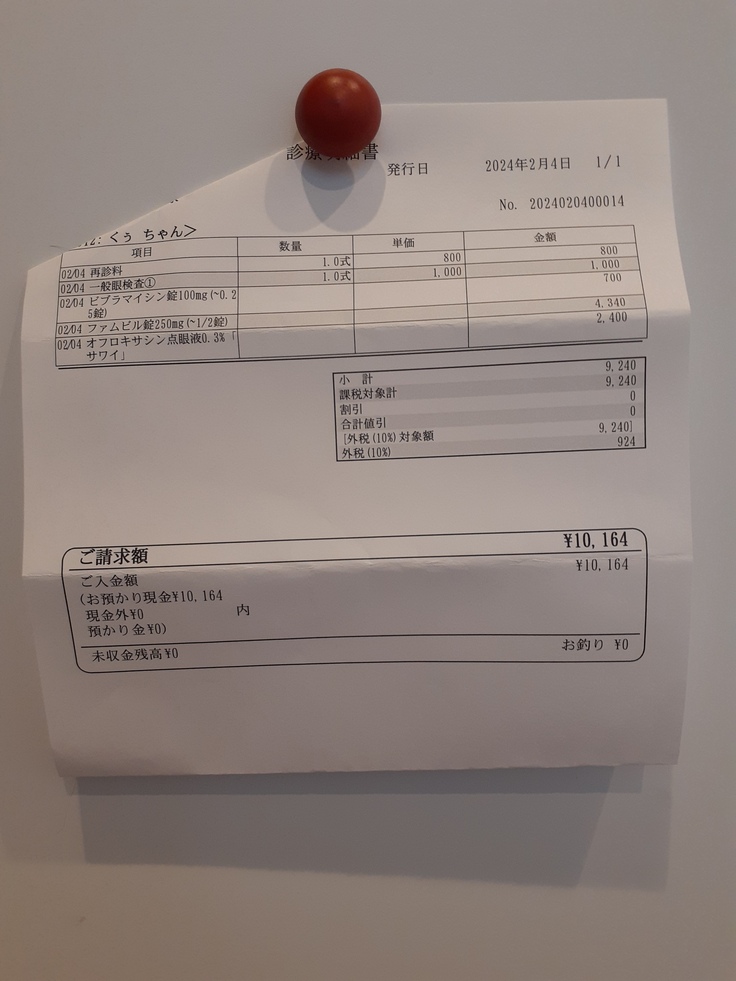 この日は診察費用、一週間分の投薬2種類、目薬2本で10164円。