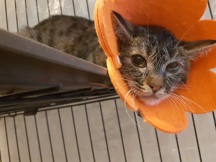 まだ眼軟膏によるケアが必要なのでエリザベスカラーをし、預かりさんがケアがしやすいようにケージにて過ごすことになります。
