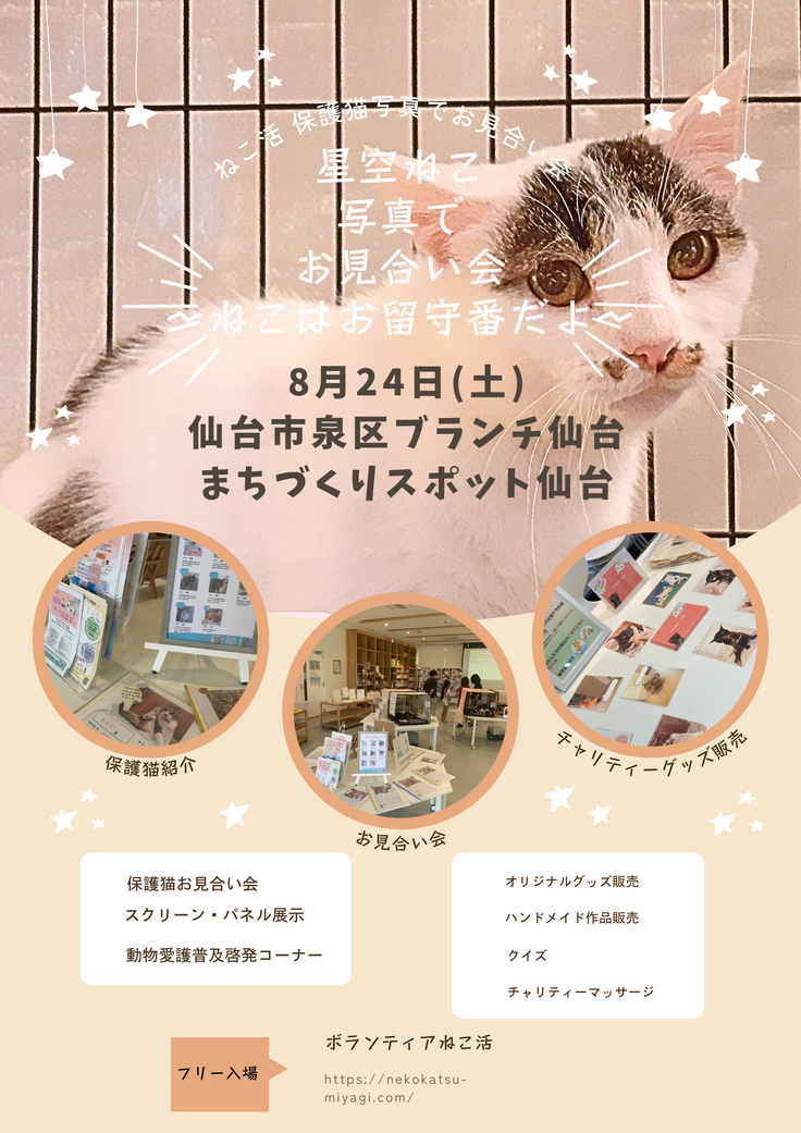 手術が重なったり、1日にしなければならないことも重なったりバタバタしますが変わらず猫達のケアをしていき、なるべく多くの情報を集め、同日22日の柴田町イオンタウン柴田内の写真でお見合い会、24日の仙台市泉区ブランチ仙台まちづくりスポット仙台のお見合い会にのぞみたいと思います。