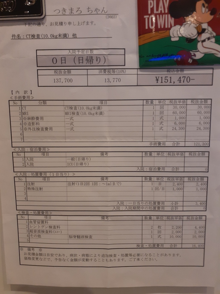 まずは手術が必要かどうかの腫瘍があるか、必要ならばできる部位なのか。そこまでを知るにしても、投薬で済むにしても検査をするのをオススメするということで見積書をいただきました。