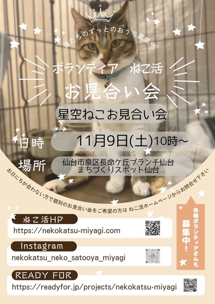9日(土)は仙台市泉区ブランチ仙台まちづくりスポット仙台にて☆星空ねこお見合い会があります。