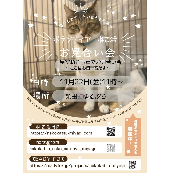 また、キャンペーンプロジェクトスタートの22日(金)は柴田町ゆるぷらにて☆星空ねこ写真でお見合い会~ねこはお留守番だよ~を開催いたします。