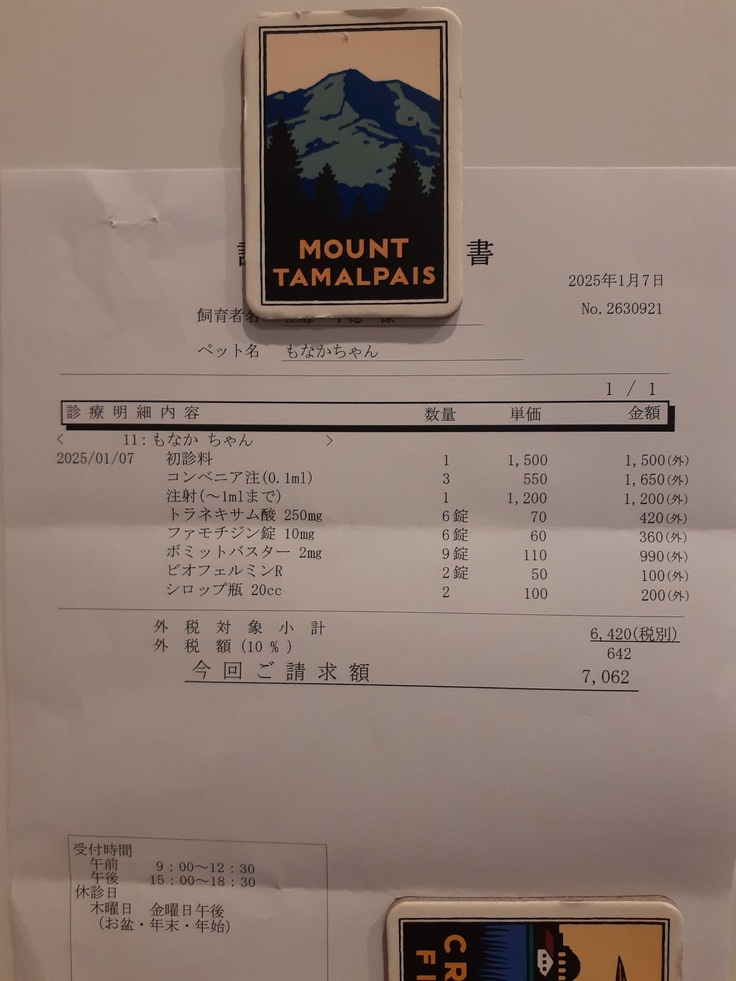 口の中は口内炎と歯肉炎が酷いことから次回の血液検査の結果次第でスケーリング、または抜糸を検討しようという話になり、取り敢えずは抗生剤と止血剤の注射、止血剤、消化器系の複数混合剤を2週間継続することとなりました。