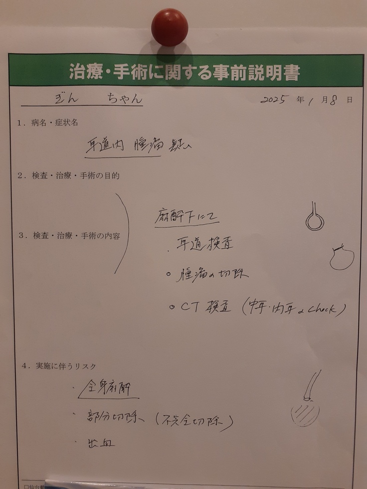 傾きやよろけがあることから内耳や中耳にも何らかの異常があるとして、外耳よりも内耳や中耳の様子の確認がメインになるとおっしゃって、内耳や中耳に異常の度合いにより内科的な処置、もしくは外科的な処置をしていくか判断するとして手術に入られました。