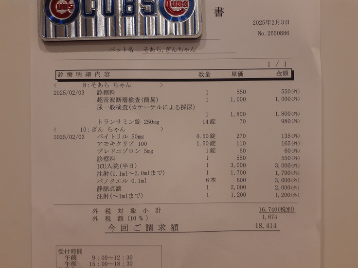 3日、この日は【ぎんちゃん】の半日入院、【そあら君】の膀胱のエコー、カテーテル挿入による採尿などをしていただきました。
