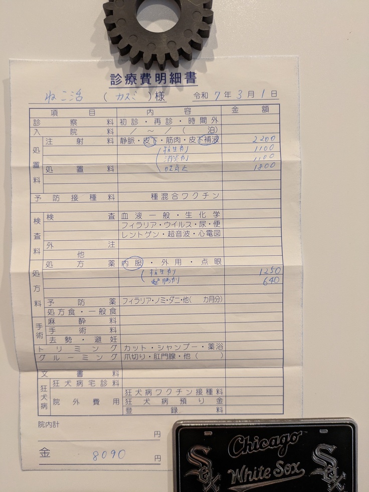 病院では輸液、吐き気止め、抗生剤、ステロイドを打っていただき、抗生剤の薬と整腸剤をいたたいてきました。