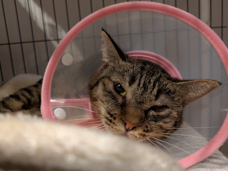 ねこ活に来た当初はかなり目が潰れた状態でしたが避妊手術と同日に瞼眼癒着手術を受けていました。