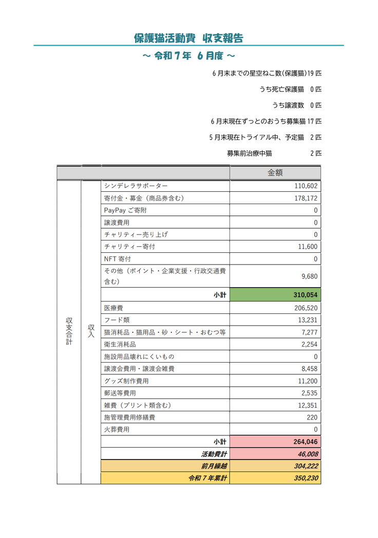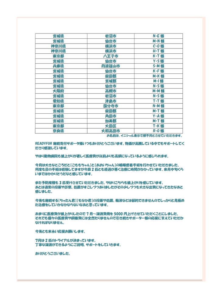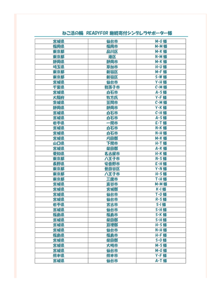 ホームページでは毎月の「収支」も報告させていただいてますがこちらのマンスリーサポーター様のイニシャル、いただいた毎月のご寄付、ご支援を「ねこ活の輪」という名前で併せてご報告させていただいています。