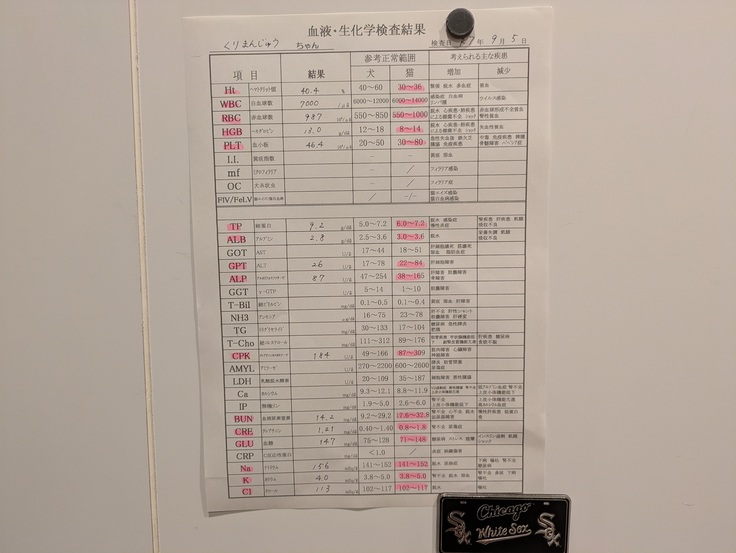 また血液検査では、前に言われていた初期の腎疾患かもという点は脱水が酷かったから腎臓の数値が上がっていたように見えたことを確認できホッとしてます。これからは脱水を改善する目的で皮下点滴をしていきます。