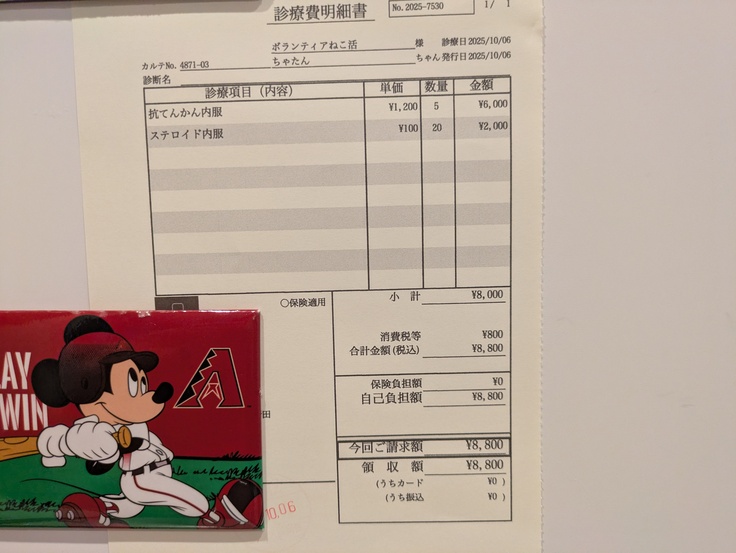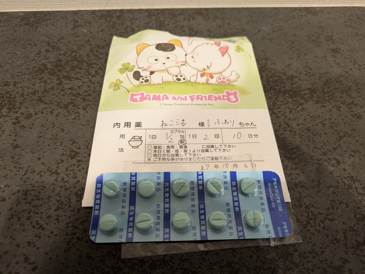とにかく逃げるので捕まえることも難しく、また投薬も何かに混ぜても敏感に察知してしまうため魚風味の抗生剤を処方してもらいました。
