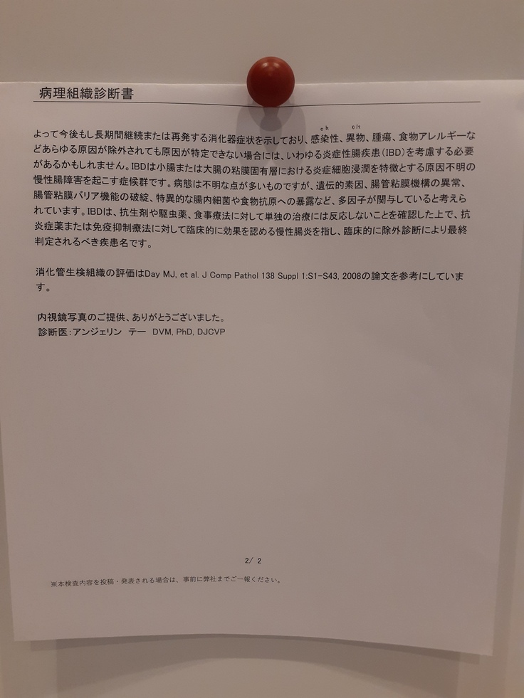 上皮内リンパ球の増加についてはネコの高分化型リンパ種で見られる変化ではあるが今回は腫瘍を強く疑う頻度・量ではないが今後治療反応が悪く臨床的に消化管の小細胞性リンパ腫を強く疑うようであれば再度精査。