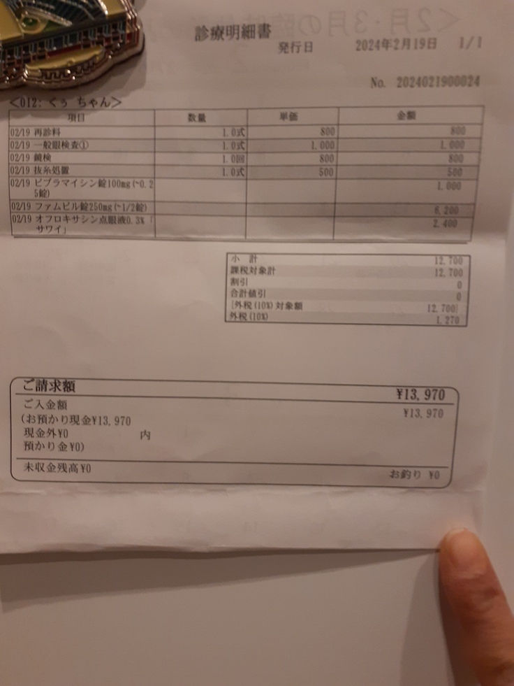 1日、【くぅ君】の手術日に【凪君】の投薬をいただきに行ったのですが電気系等の故障により医療費を支払えなかったので本日お支払いをしてきました。