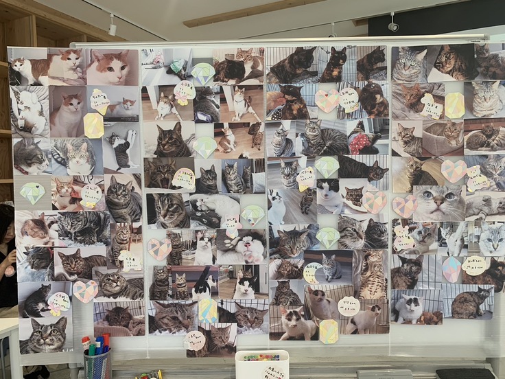 こちらはお見合い会で緊張してしまって可愛さを発揮できない猫達、お見合い会には参加できなかった猫たちの普段の様子をパネルにしたものです。そしてお気に入りの猫にハートをつけていただく参加型のものでじっくり写真を選んでいただくことでねこ活の猫を知っていただく狙いがあります。