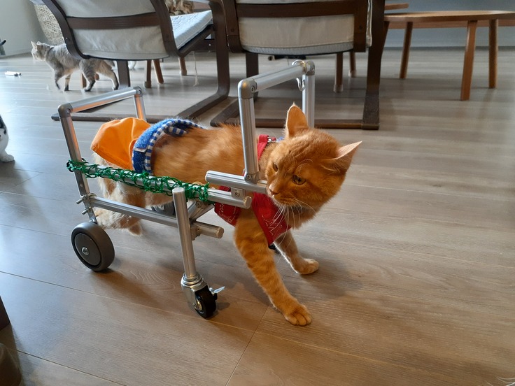 職員さん方々は下半身不随の茶トラ猫が歩けるようにと補助器を作ってくださっていました。