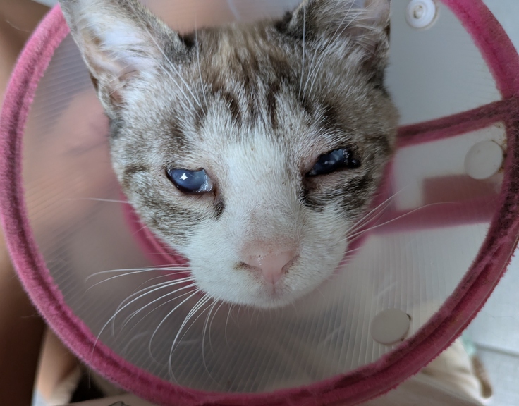 [あおいちゃん]は先週水曜日からの本日。本当は1週間後の診察の予定ではありましたが予約が取れないこと、1時間以上かけて2匹を交互に通院するのがとても大変だったので本日[こももちゃん]の診療予約に合わせて診察をしていただきました。