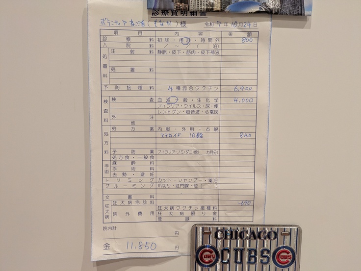 朝、[くりまんじゅう君]をお願いしたあと一旦戻り、[もなか君]の予防接種と皮膚の状態をみていただきにいきました。
