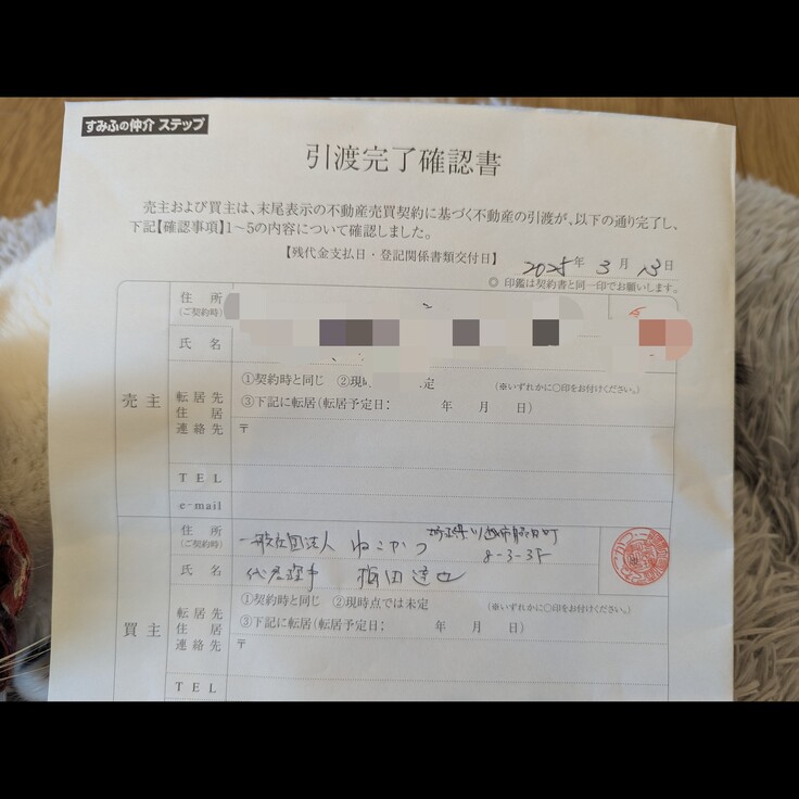 3月13日、本日シェルター物件の支払い・引き渡し手続が完了しました。