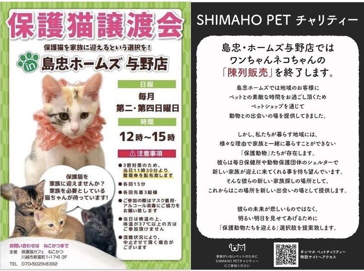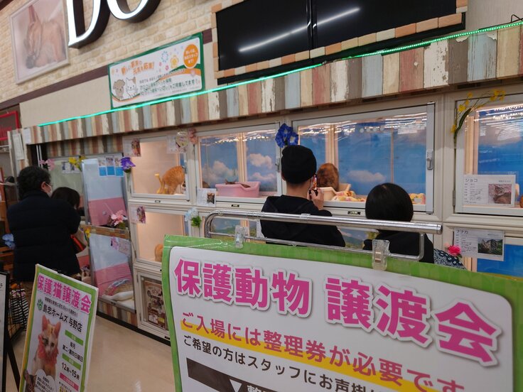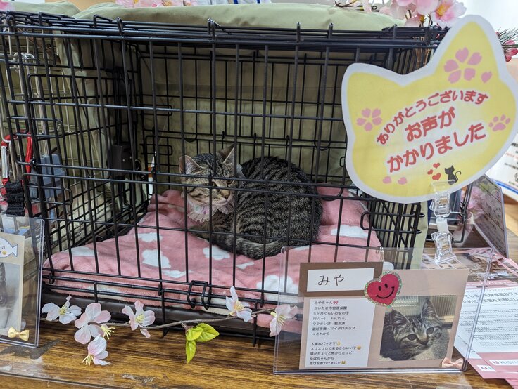 こちらは、以前はペットショップの生体販売のスペースでしたが、生体販売をとりやめ保護猫譲渡会のスペースになりました。全国でも珍しい取り組みのひとつになります。