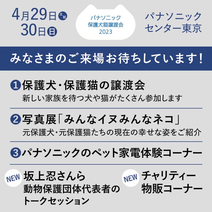 GW4月29日30日にパナソニック保護犬猫譲渡会が開催されます。
