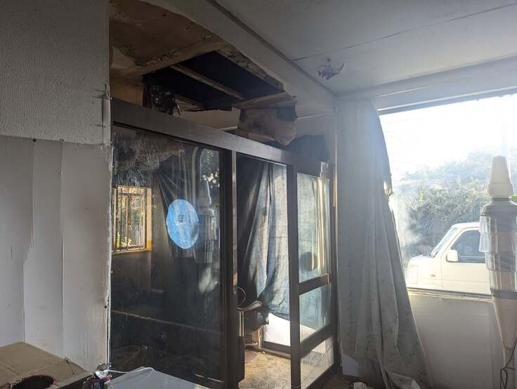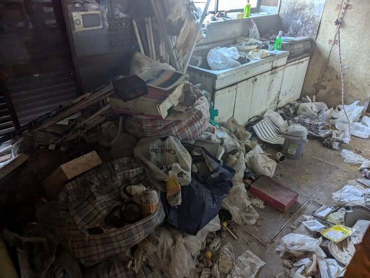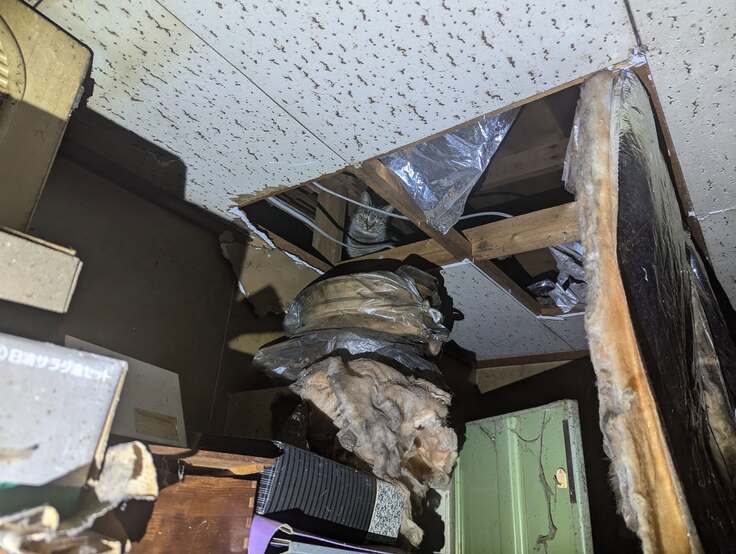 壁に穴が開き、天井も崩れた家は、家主の生前から荒れ果てていてゴミ屋敷化していたのがわかりました。玄関先には懐っこい白黒の猫。穴の開いた天井からは猫が覗いていました。
