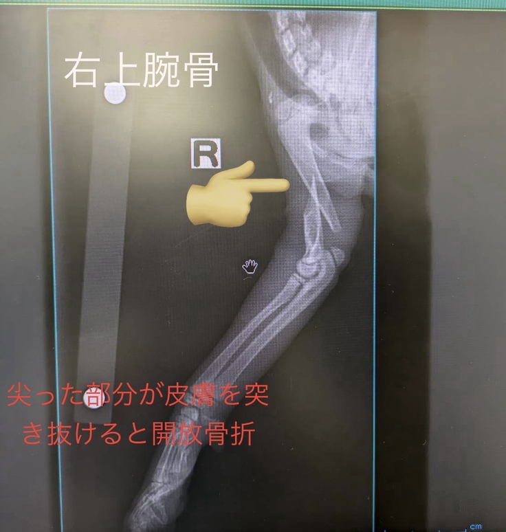 骨折部付近の軟部組織の損傷もみられたため今後左右差なく成長していくかなどは経過観察となりました。