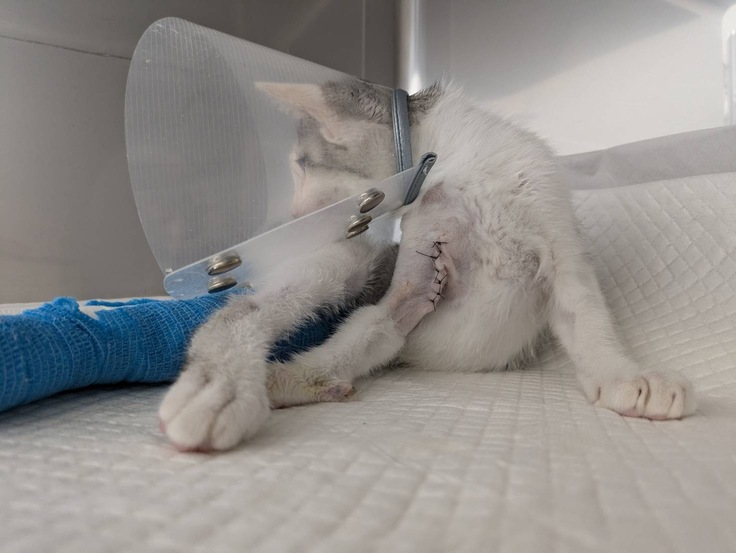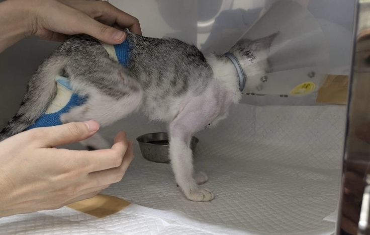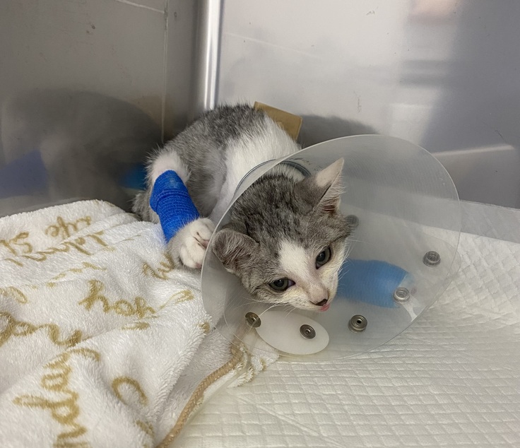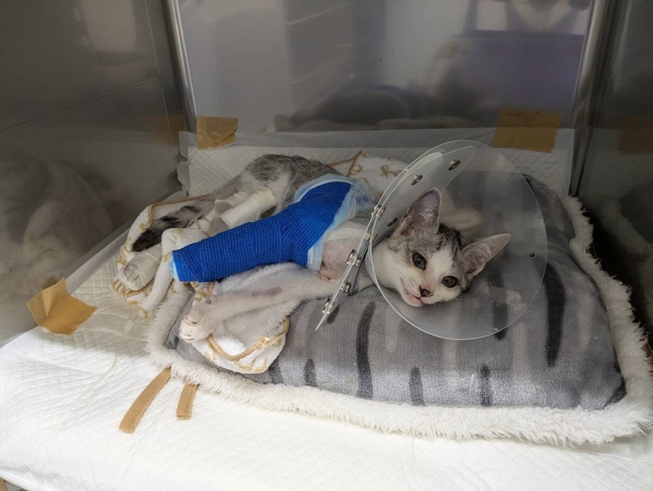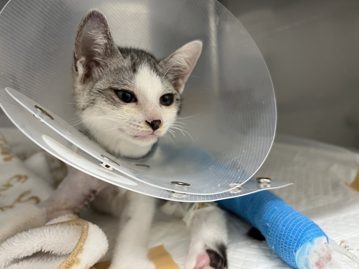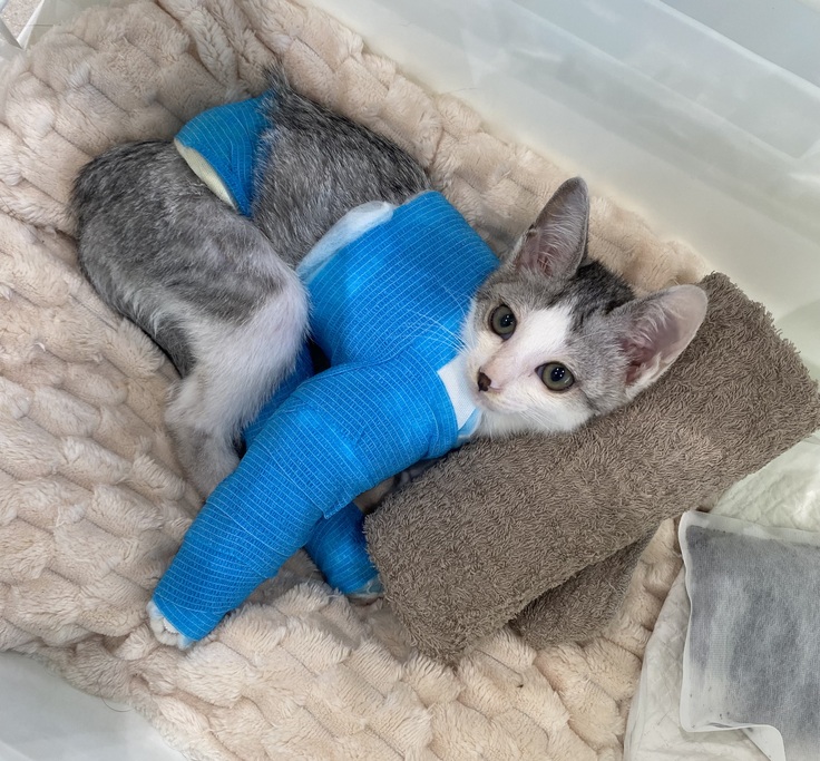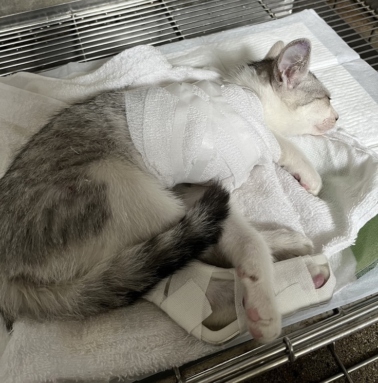 そこで、本プロジェクトでは2024年7月に保健所より引き取り、右上腕骨、左脛骨を骨折している子猫のタビちゃんの治療費を募らせていただきます。