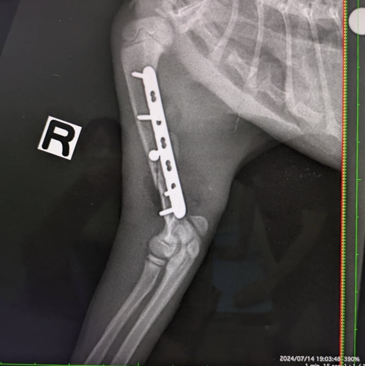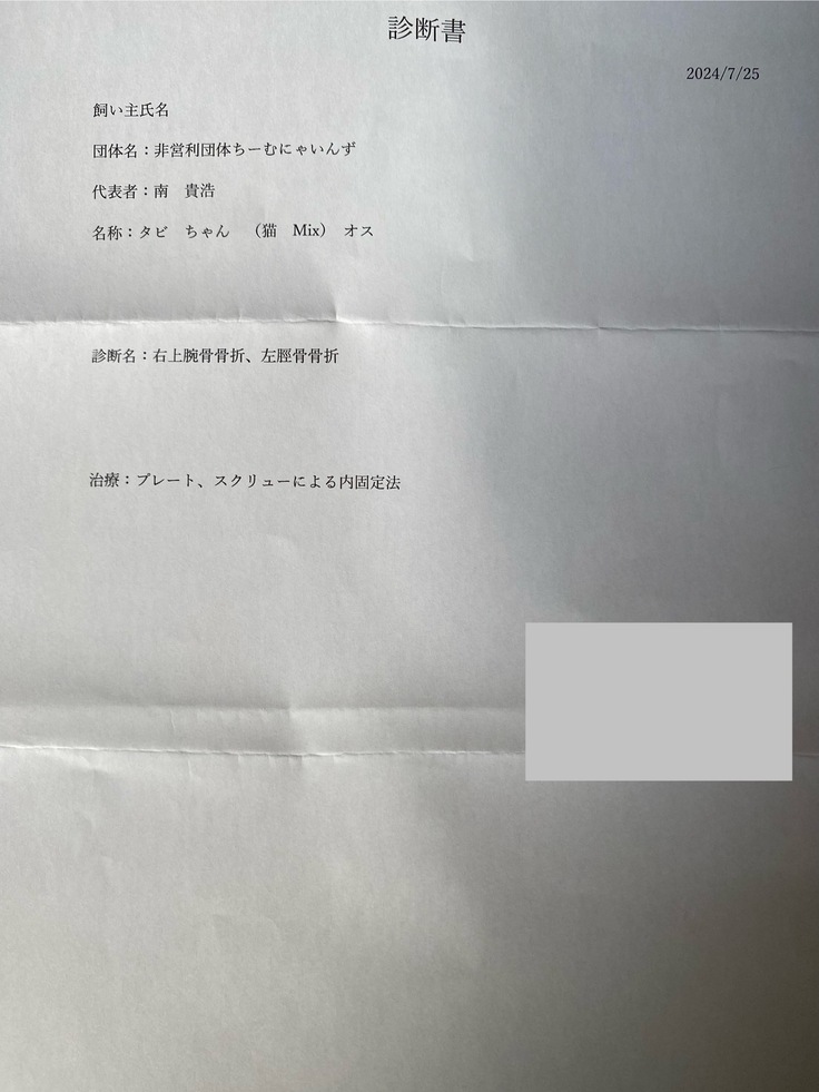 2024年7月12日保健所より連絡を受け、引き出し。応急手当は済んでいたものの瀬戸市内の動物病院へ。そこで右上腕骨骨折、左脛骨骨折との診断を受けました。