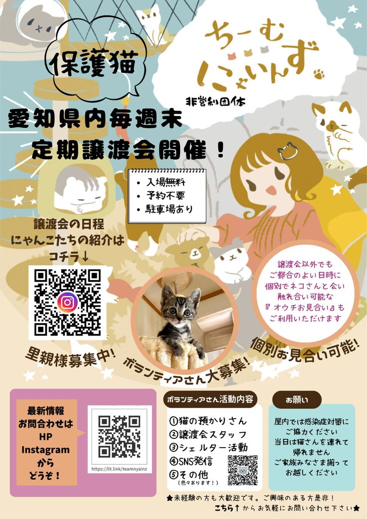 冒頭でも紹介させていただきましたが「ちーむにゃいんず」は愛知県を中心に保健所や地域の野良猫、多頭飼育崩壊現場からの猫の保護と、その猫たちの譲渡活動をしております。