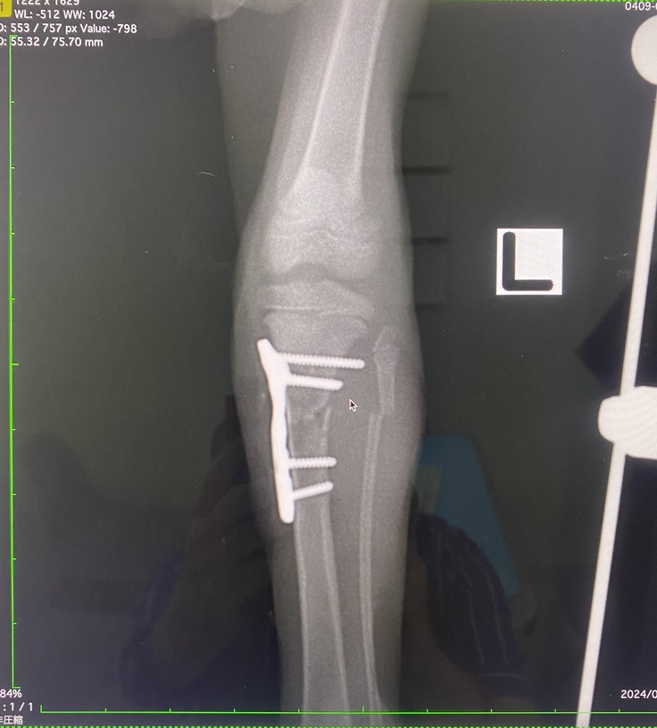左下肢は脛骨骨折と腓骨の不完全骨折で脛骨は上腕と同じくプレートでの固定をしました。腓骨は細いため自然に癒合するのを待つことになりました。