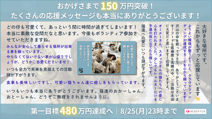 6月27日(金)からスタートした『保護施設の拡充 ~ゆりかごからお墓まで〜|終生保護を叶える場所へ』プロジェクトですが、おかげさまで150万円を突破いたしました!