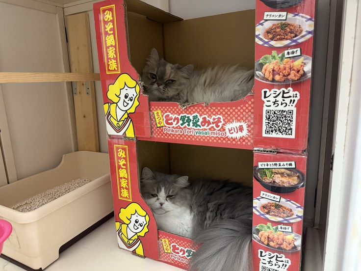 トイレ砂を購入した時に出る段ボールや、スーパー等で頑丈な段ボールを選んで2階建てのお家を作ったりしていました。