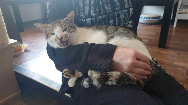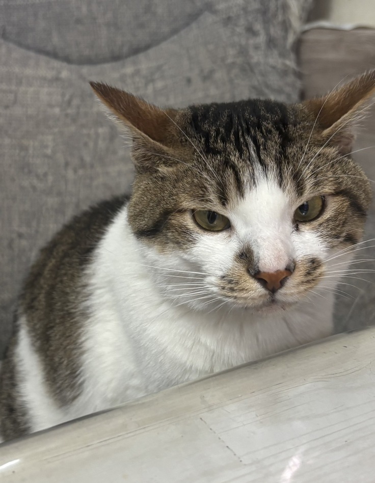 そこのコンビニの店員さんに聞いてみたところ、1年ほど前からこのコンビニ近辺に住み着き、お客さんからご飯を貰いながら生活していること、トラックも多い地域でいつ轢かれてしまうか不安なこと、たまに車やバイクにぶつかられてしまうのか足を引きずっていることもあると聞き、保護することを決意。