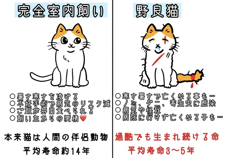 比べればその差は歴然で、「外で自由に」という考えが猫の幸せにつながらないことは明らかです。