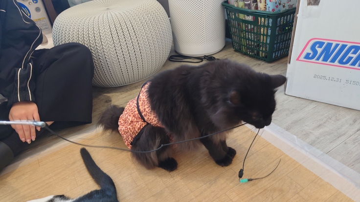 きょうだいのなかでもとびきりモフモフ、珍しい白いまつ毛(今はほとんどなくなってしまいました)、ピカチュウみたいなギザギザしっぽが可愛かったので、スタッフみんなでオーナーに交渉して店長候補として里親募集せずに茶屋へ残ってもらいました。