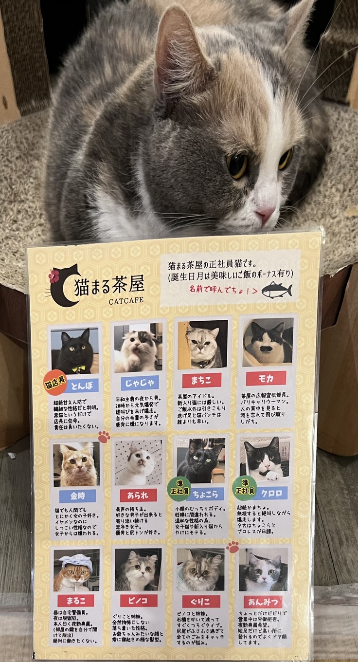 茶屋にいる猫たちはそれぞれに個性があり、とても可愛い存在です。店内には猫たちの名前や写真、性格を書いた紹介カードもありますので、ぜひご覧ください。