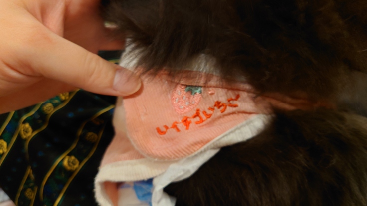 『いイチゴいちご』の謎文言も愛らしいですね。適当に中華通販で買うからこうなるんだちくしょう。(さすがにもう少しちゃんとした日本語の刺繍が届くと思ってたんです……)