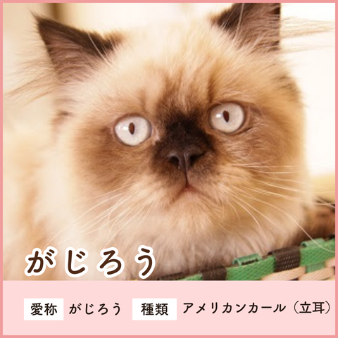 コメント:ワイルドな見た目だけど実はとても甘えん坊。ただし、おやつの時は野生が出 るので要注意!