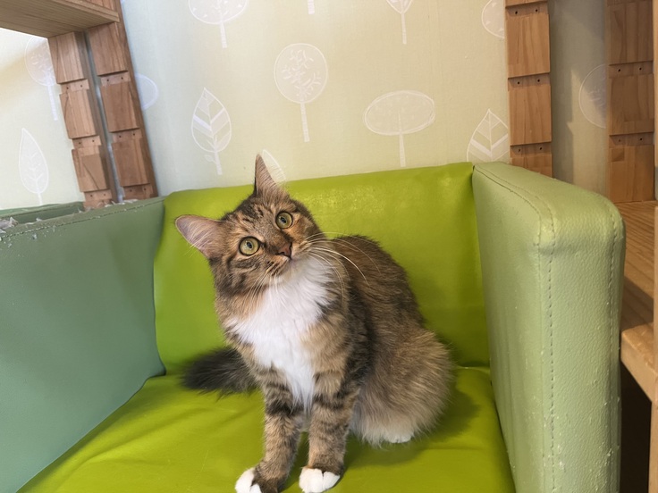 とっても美人なこむママです。少しビビリさんですが最近ではフロアーでちょくちょく見かけるようになりました。保護当初はガリガリでうまく出産できるか心配でしたがとても子猫を可愛がる優しいままさんです。(推定1歳半~2歳)