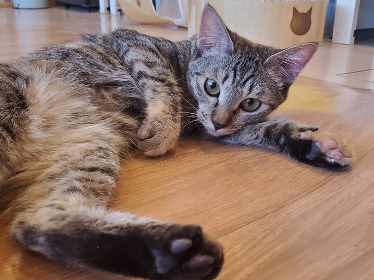 人も猫も大好き。よく遊びよく寝ます。ご飯もモリモリ食べるので大きくなる予感の子です。