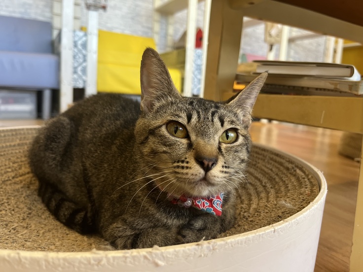 パッと見サビ猫のエリカ様ですがお腹の一部が白いのです。遺伝子的には三毛猫なので秘密の三毛猫と呼んでいます。よかったらお店に来た時にエリカ様に見せてもらってください。