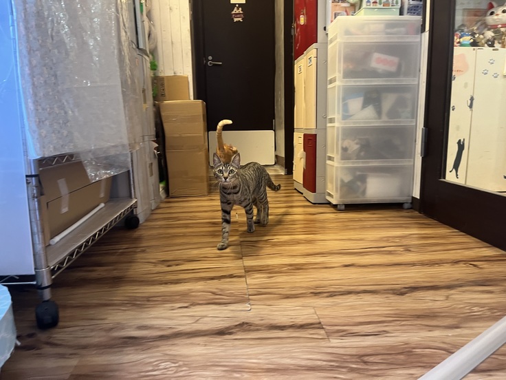 とてもびくびくしていたのでまずは猫まるカフェのバックヤードの一番奥のフロアーの音が届きにくいところをお部屋にしました。でも警戒心が強くなかなか慣れませんでした。
